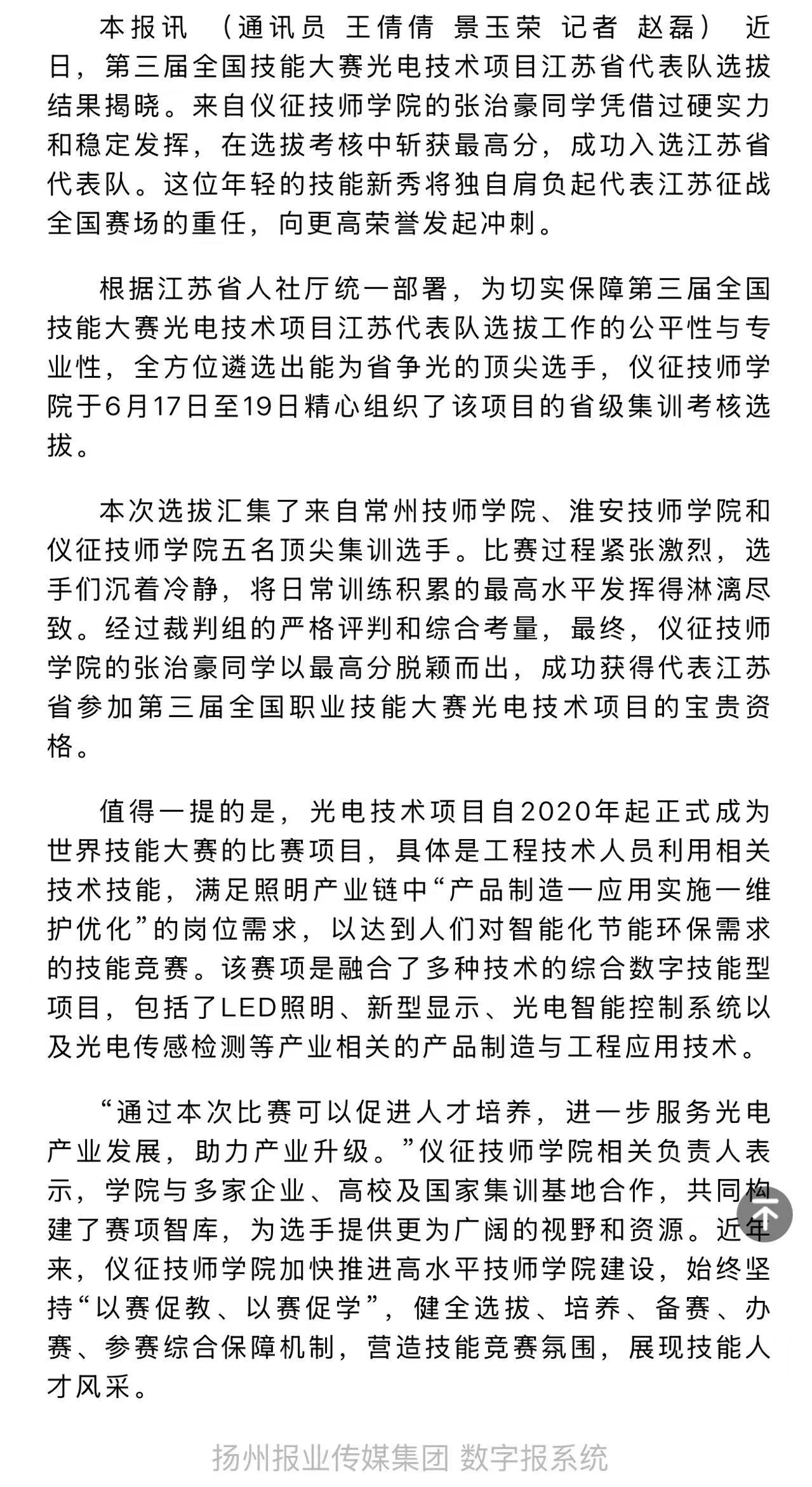 扬州日报关注报道仪征技师学院张治豪代表江苏出征全国技能大赛