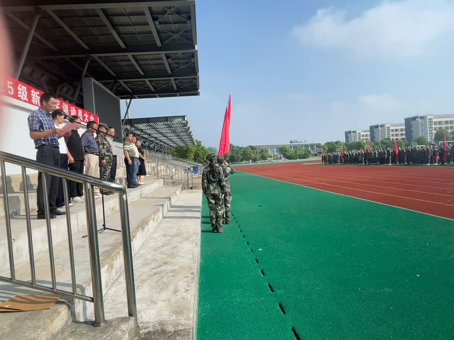 此次动员大会由任国庆处长主持,他首先介绍了参加今天活动的嘉宾和领导。庄严的升旗仪式后,学员代表电气工程系25电气高职班朱文俊同学和教官代表董磊同志分别作了表态发言。