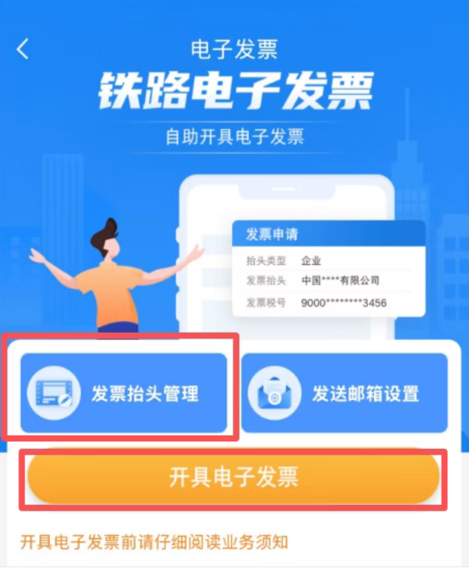 登录铁路12306APP→我的→我的订单→电子发票→发票抬头管理→开具电子发票
