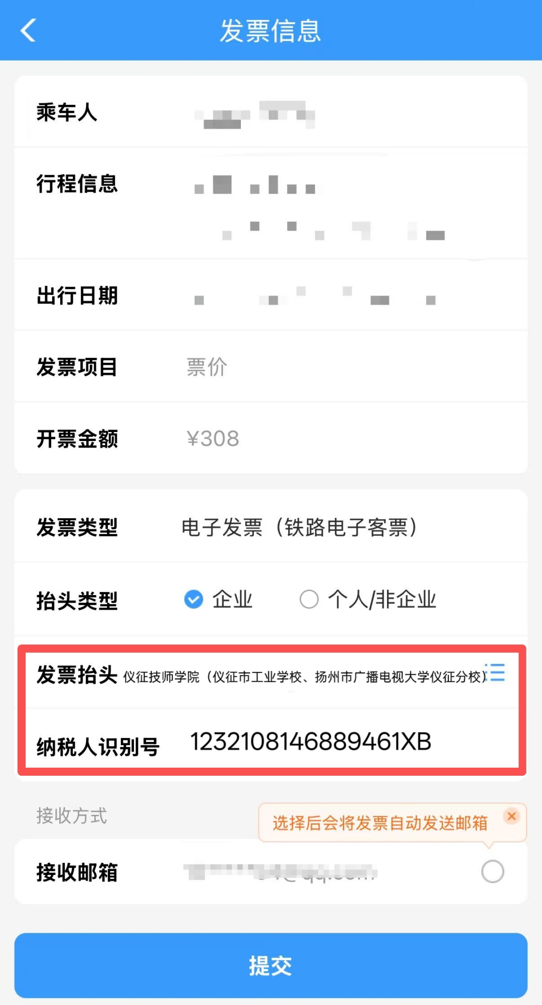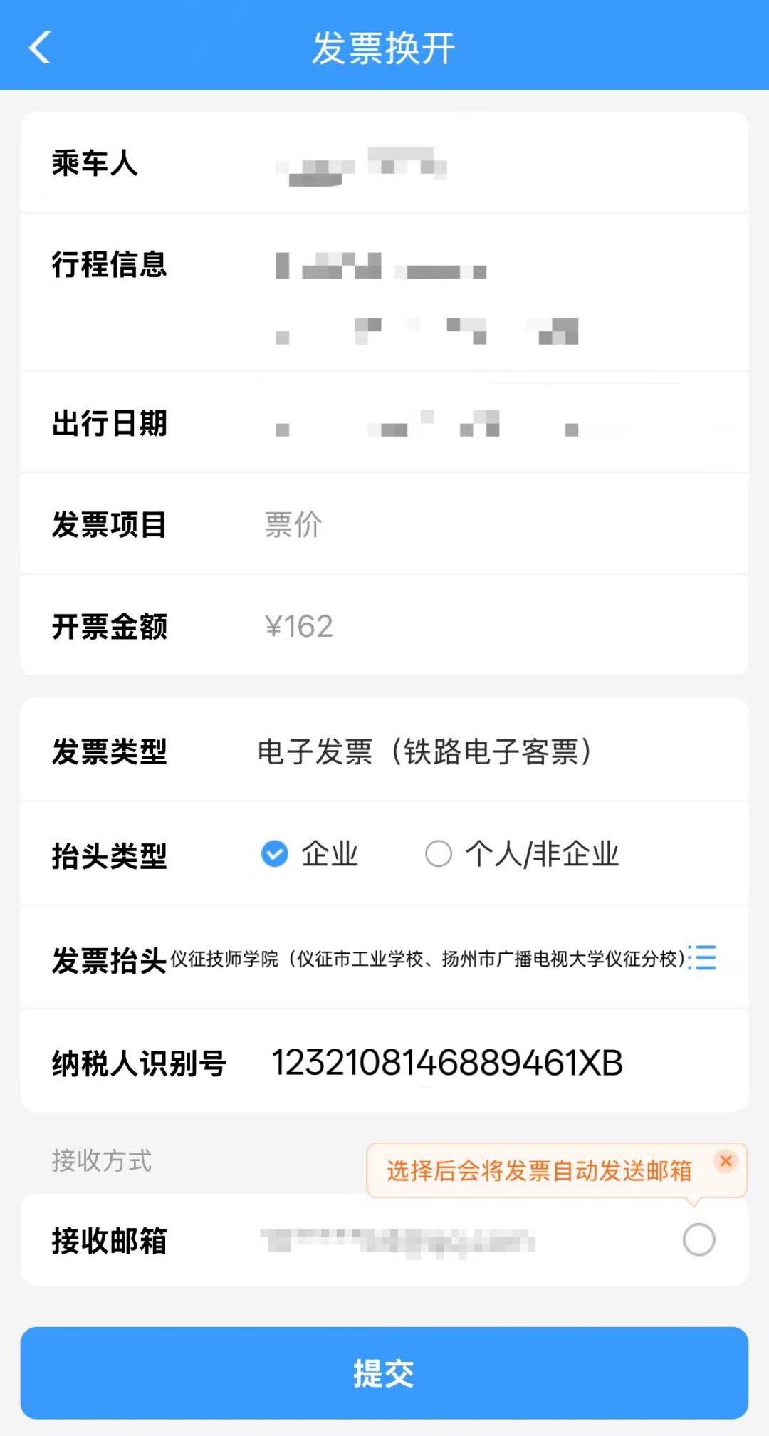 2.购票平台:我的订单→我要报销,填写发票信息。