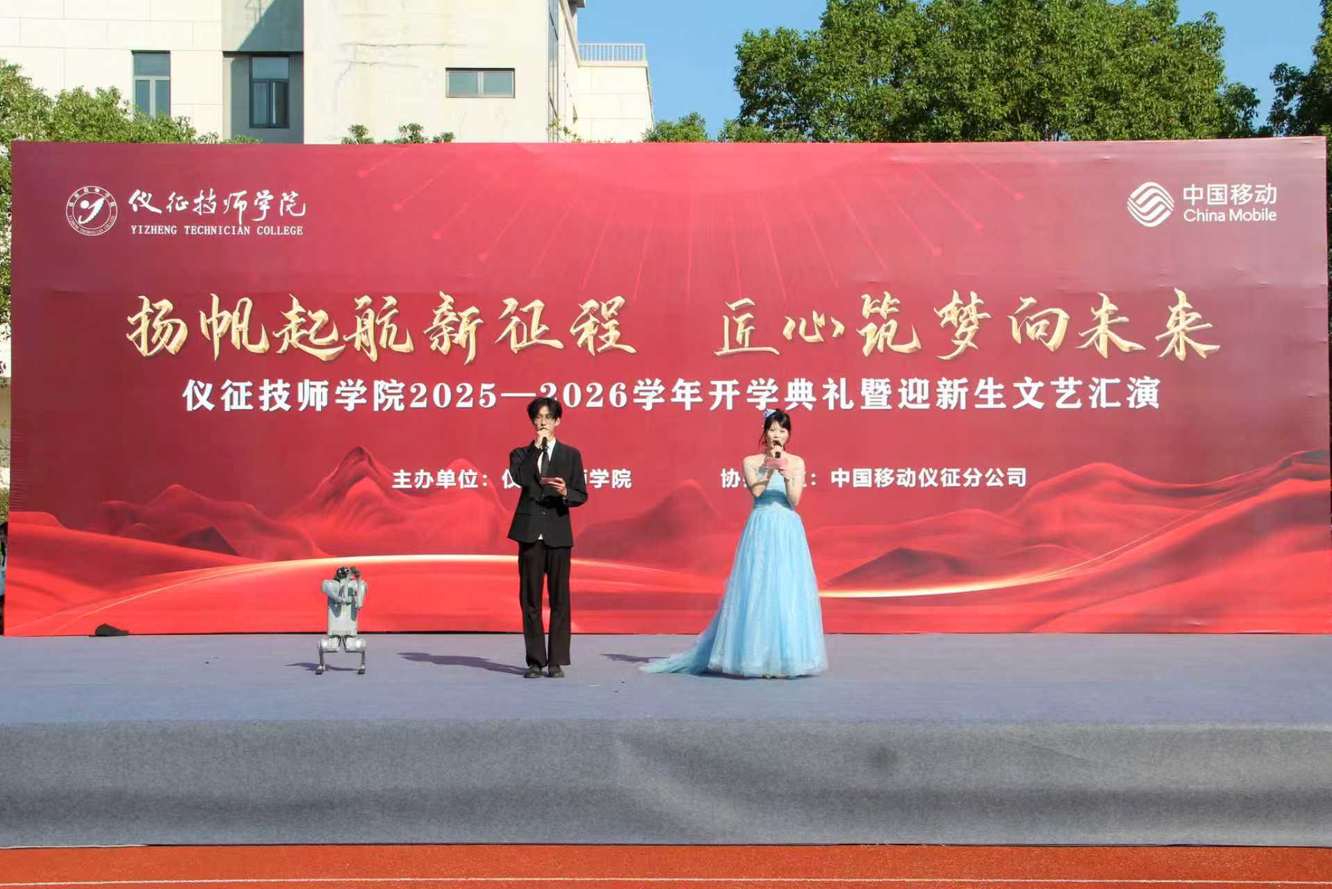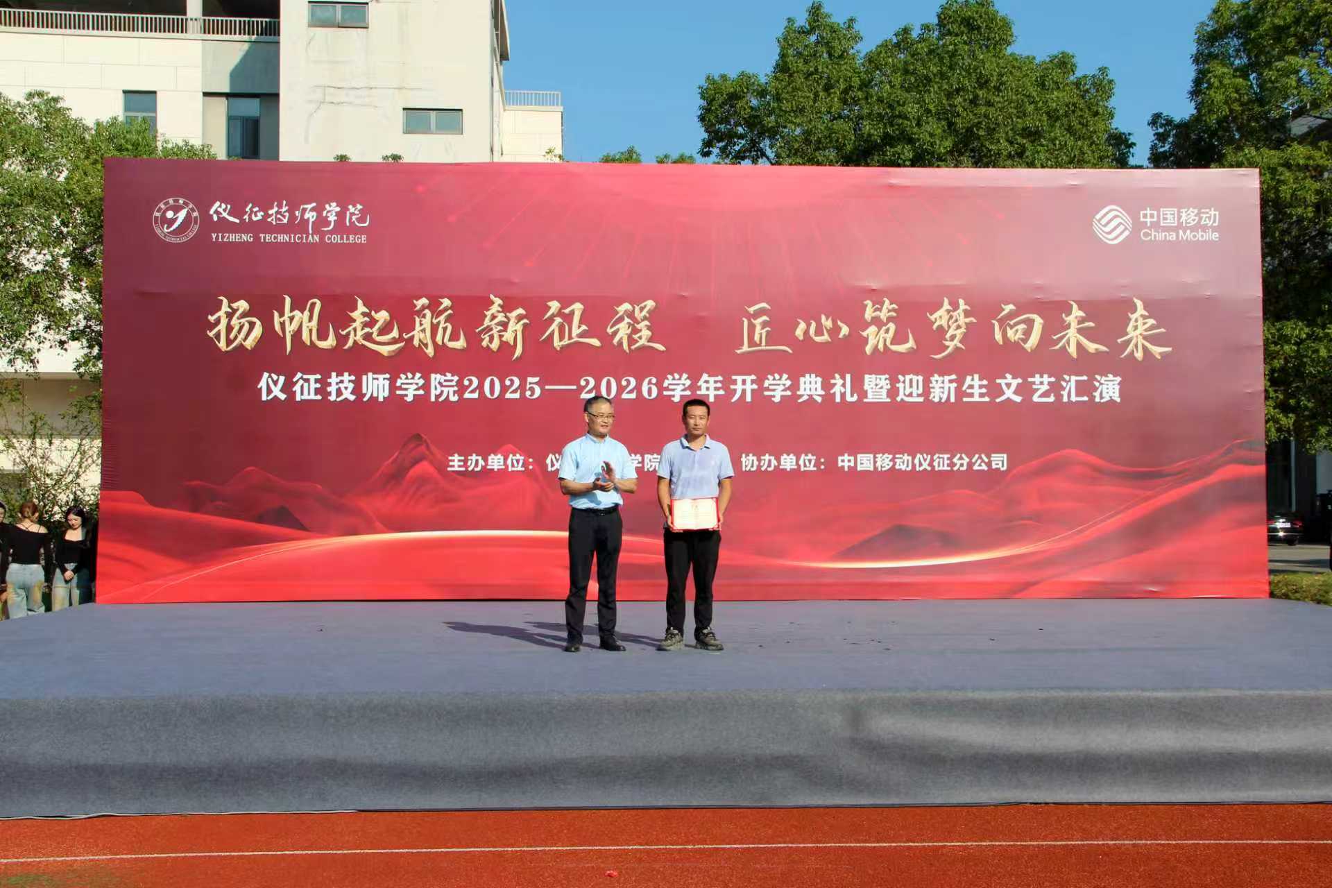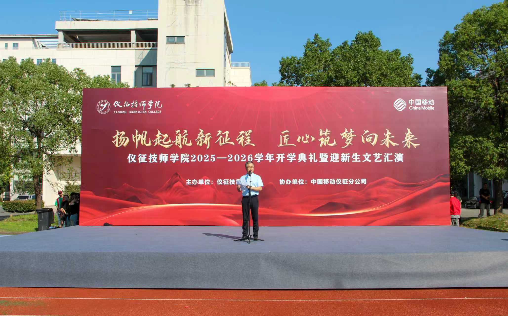 10月10日下午,仪征技师学院在操场举行2025-2026学年开学典礼暨迎新生文艺汇演。仪征市副市长、科技镇长团团长陈苗,仪征市政府办公室副主任丁勋,中国移动仪征分公司总经理纪晓辰、经理刘晓辉,江苏高精人才智能科技有限公司总经理庄宇晨,仪征技师学院院长周万春及学院全体师生出席活动,典礼由学院团委书记夏敏主持。