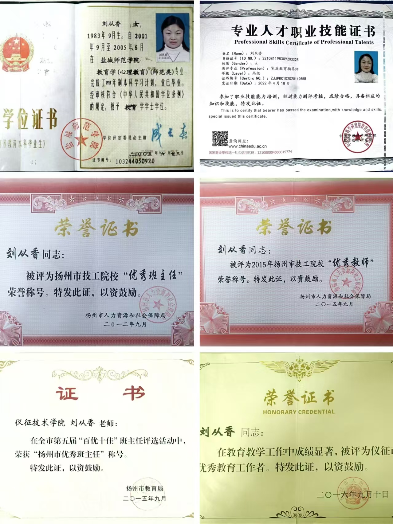 刘从香,心理教育专业本科毕业,从教20年来一直从事心理健康教学及学生心理咨询工作。曾获“江苏省职业院校教学能力比赛”一等奖,荣获 “扬州市优秀班主任”“扬州市优秀教师”“仪征市优秀教育工作者”等荣誉称号,担任技工院校学生职业素养系列读本《我与心灵有个约会》副主编。作为仪征市心理协会会员,擅长青少年心理辅导及家庭教育指导。