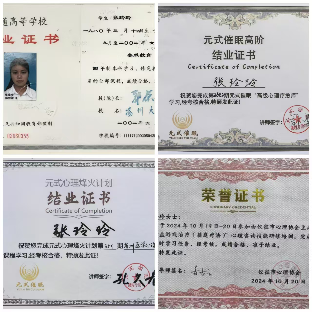 张玲玲,美术教育专业本科毕业,仪征市心理协会会员,近几年系统学习心理学相关课程并取得相关证书。定期在班级开展团体辅导以及个案疗愈,擅长谈话、催眠、沙盘等形式心理辅导,帮助学生打开心结,消除不良情绪。