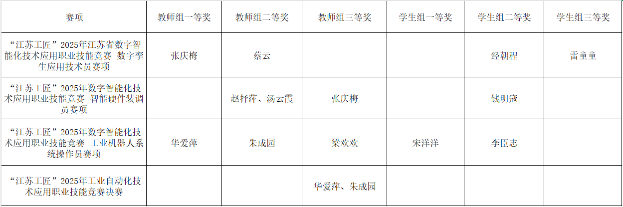 近日,“江苏工匠”2025年江苏省数字智能化技术应用职业技能竞赛赛场捷报频传。本次竞赛由江苏省人力资源和社会保障厅等部门联合主办,是省内数字智能化技术应用领域规格高、覆盖面广、影响力大的权威赛事。竞赛紧密对接产业升级与技术发展趋势,旨在通过“以赛促教、以赛促学、以赛促改”的方式,为我省数字经济高质量发展选拔和储备高素质技术技能人才。
