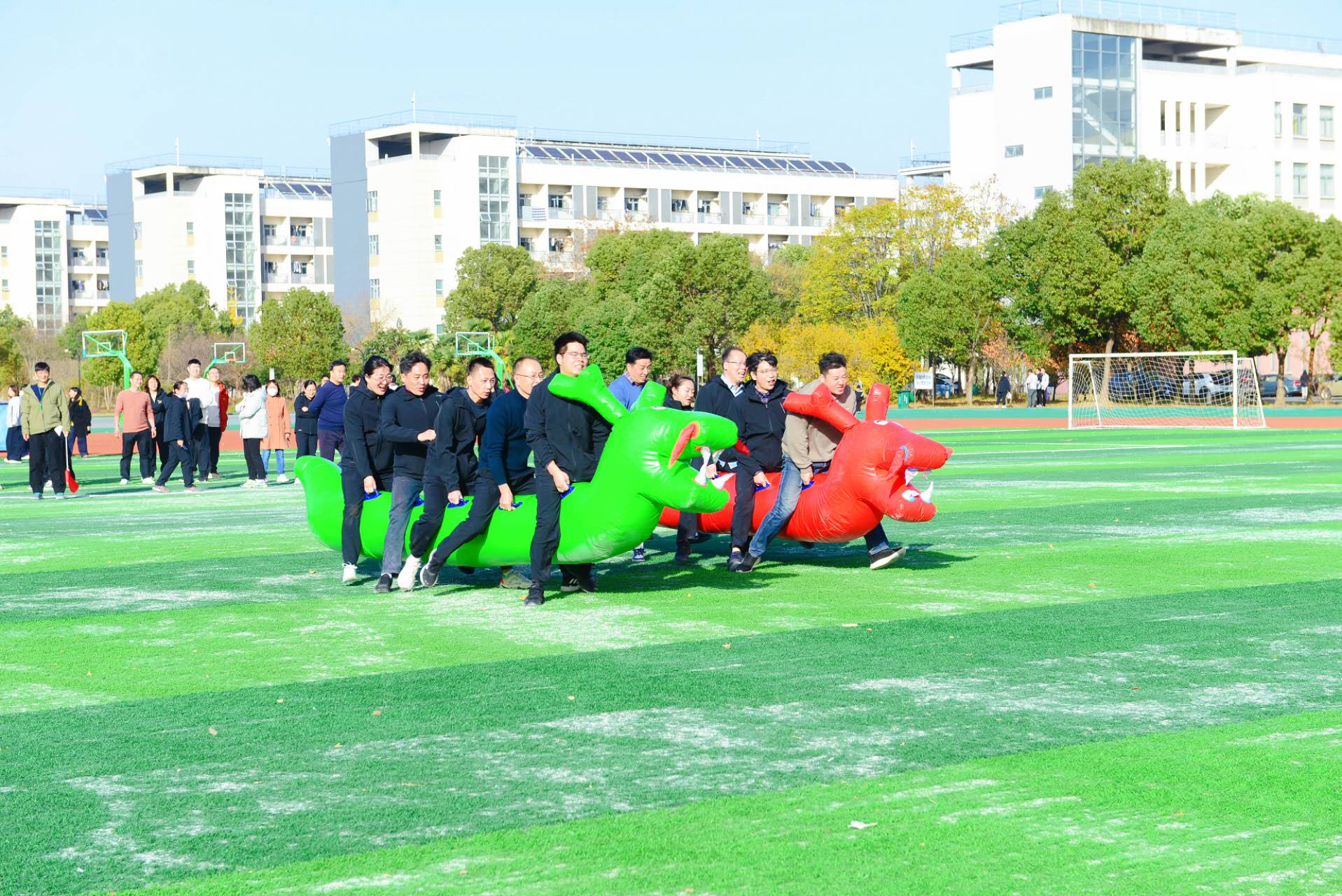 本次比赛分为团体项目和单项赛,团体项目设置了七人八足、旱地龙舟和拔河,单项赛包括小马过河、颠球、保龄球、投篮和投壶。全院教职工和上汽大众仪征工厂代表共组成了9支队伍参与角逐。
