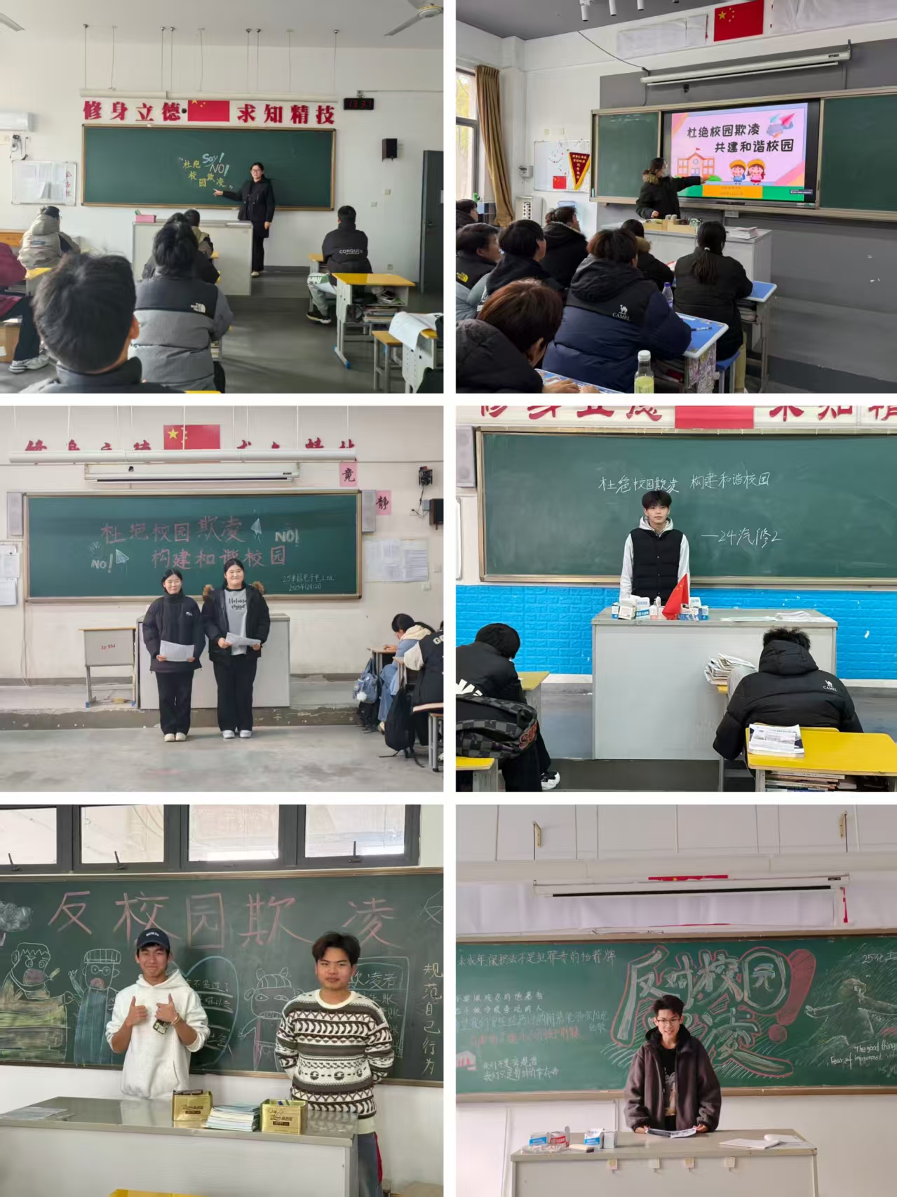 班会课上,各班围绕“杜绝校园欺凌,构建和谐校园”主题,采用“宣讲+互动”相结合的形式开展主题班会活动。班主任依托学生工作处统一提供的PPT课件,系统讲解了校园欺凌的表现形式、危害后果及法律责任等,并结合真实案例引导学生掌握正确的应对与求助方法。随后,各班级自主开展拒绝校园欺凌演讲比赛、知识竞答、情景剧表演等丰富多样的互动环节,让学生在参与中深化认识、增强自护能力。