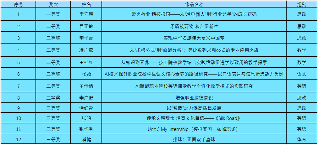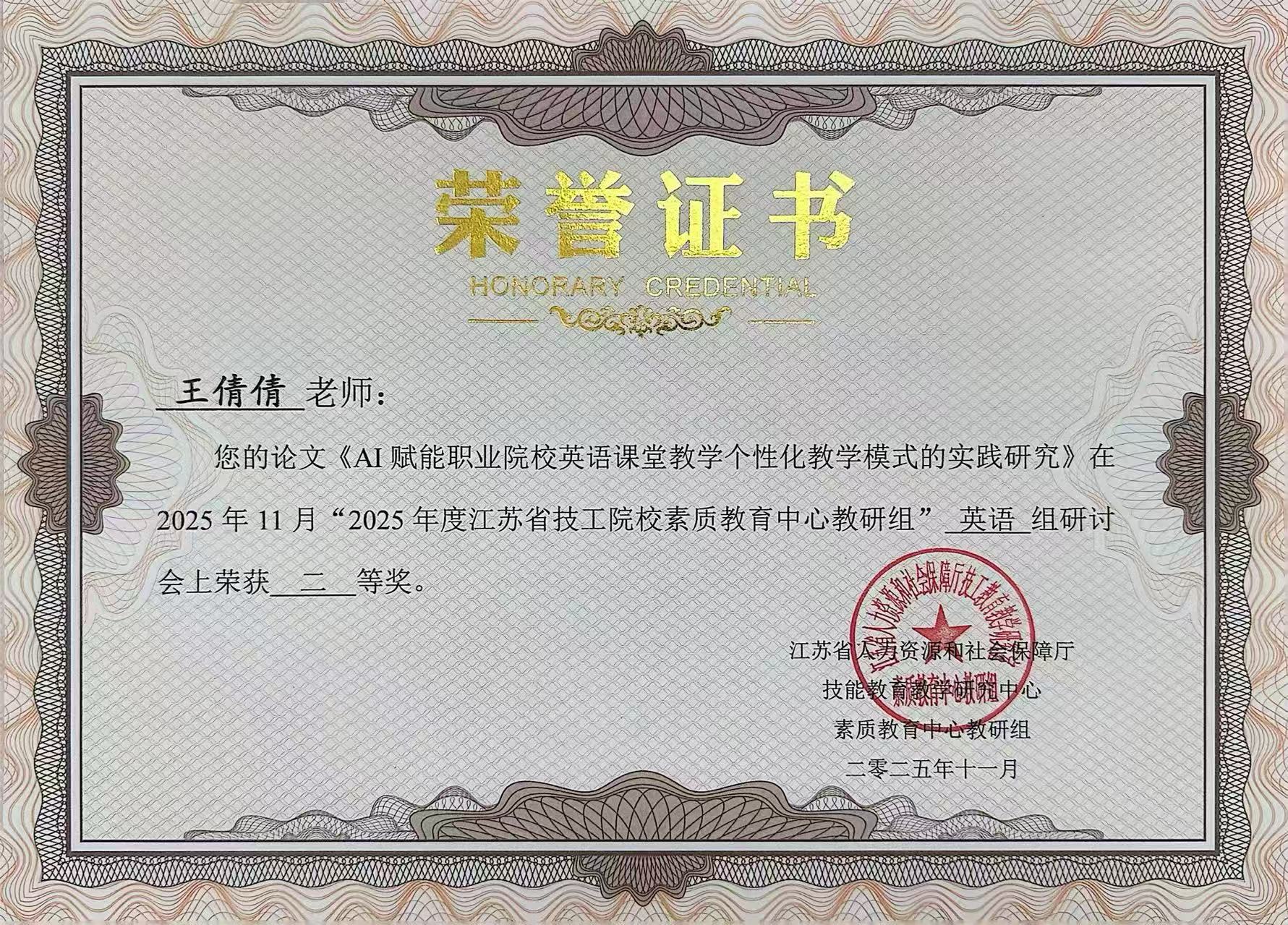 近日,江苏省技工院校素质教育中心教研组2025年度教科研成果评比结果揭晓,学院共获得一等奖1项,二等奖6项,三等奖5项。 本次教研活动旨在加强全省技工院校素质教育工作经验交流,促进技工院校教师职业能力提升,深化文化基础课教学改革。同时,活动组织开展了思政、语文、数学、英语、体育、历史等学科的教学成果评比。 一等奖 二等奖 今后,教研室将积极发挥优秀教学成果的示范引领作用,持续加强课程建设,继续深化教育教学改革,不断提升教科研质量水平。 审核:陈煜 通讯员:曹德臣