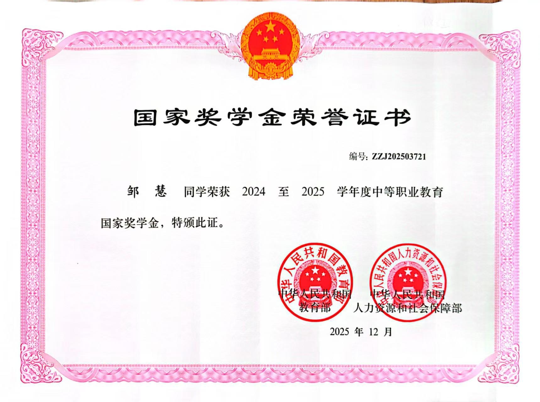 中职国家奖学金是对邬贝贝、邹慧同学德技并修、全面发展的充分肯定。未来,她们将继续坚定理想信念,提升专业技能,在技能成才、技能报国的道路上不断奋进。