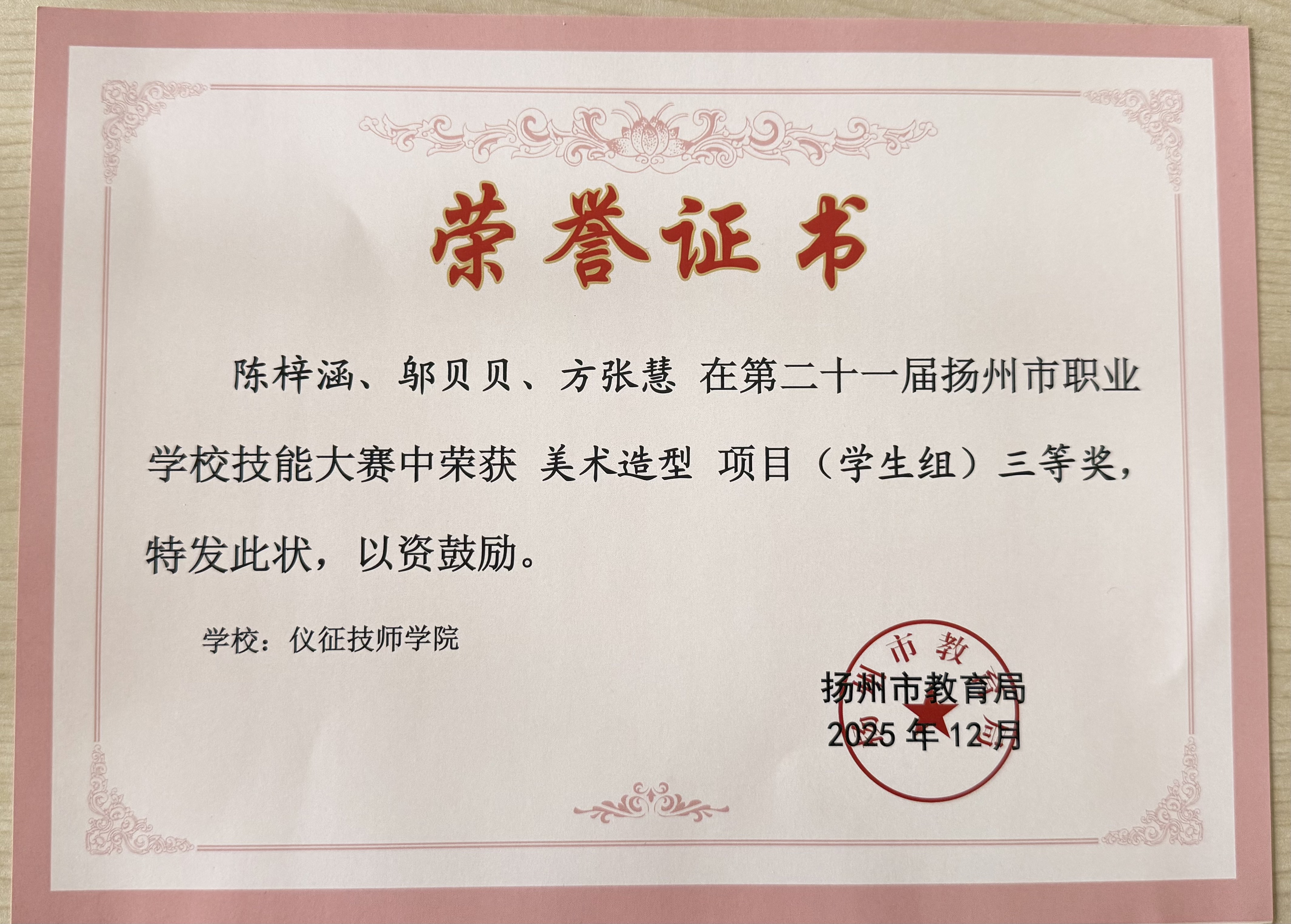 邬贝贝同学始终以学习为首要任务,学习态度端正、目标明确、积极进取,注重理论知识与专业技能并重。她始终保持谦逊严谨的学习作风,刻苦钻研文化知识与专业内容,勤学善思、苦练本领,文化课与专业课成绩在班级始终名列前茅,每学期均获评校级 “三好学生”。此外,她在第二十一届扬州市职业学校技能大赛中荣获美术造型项目(学生组)三等奖,在2026年职教高考技能考试中,取得285分的好成绩。