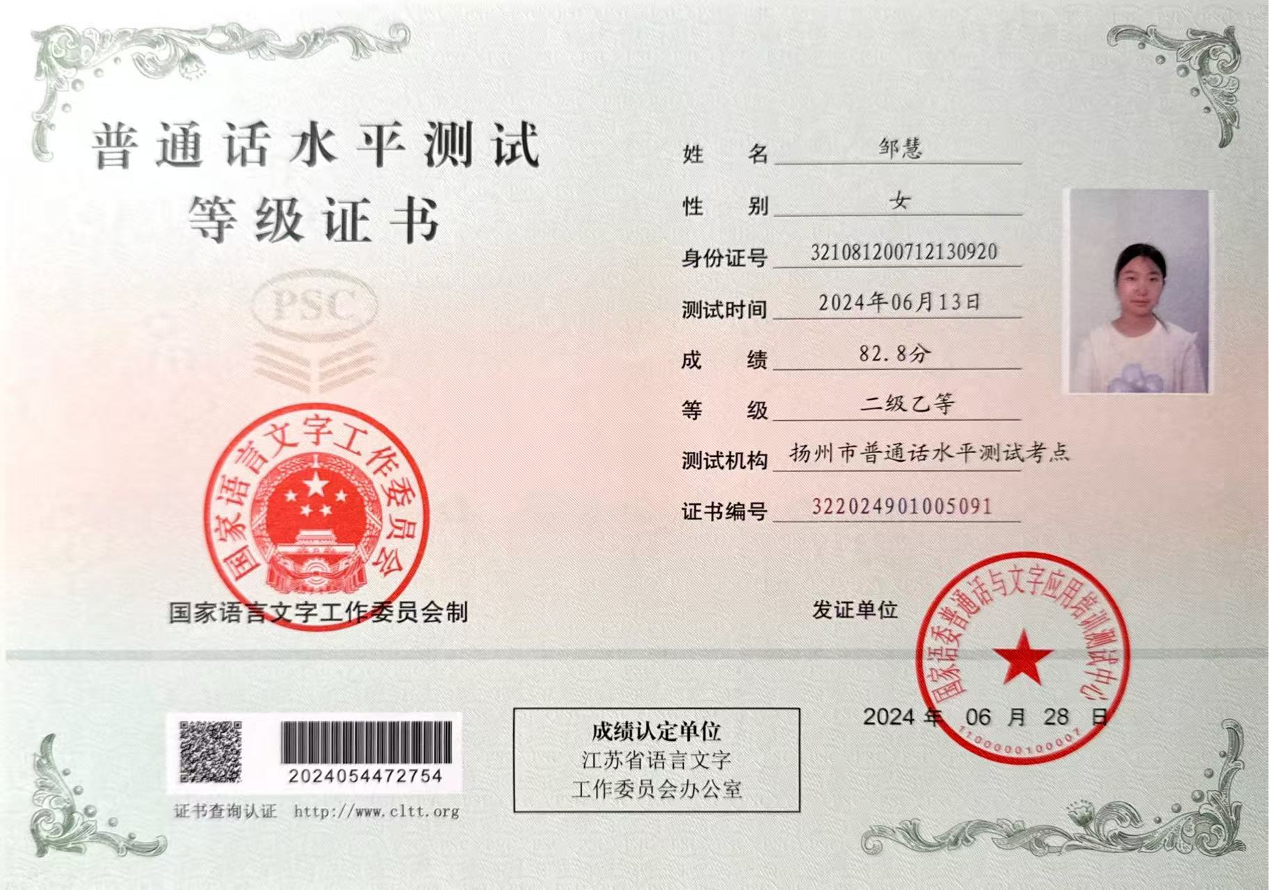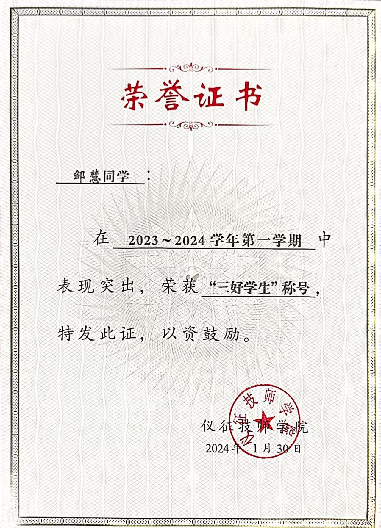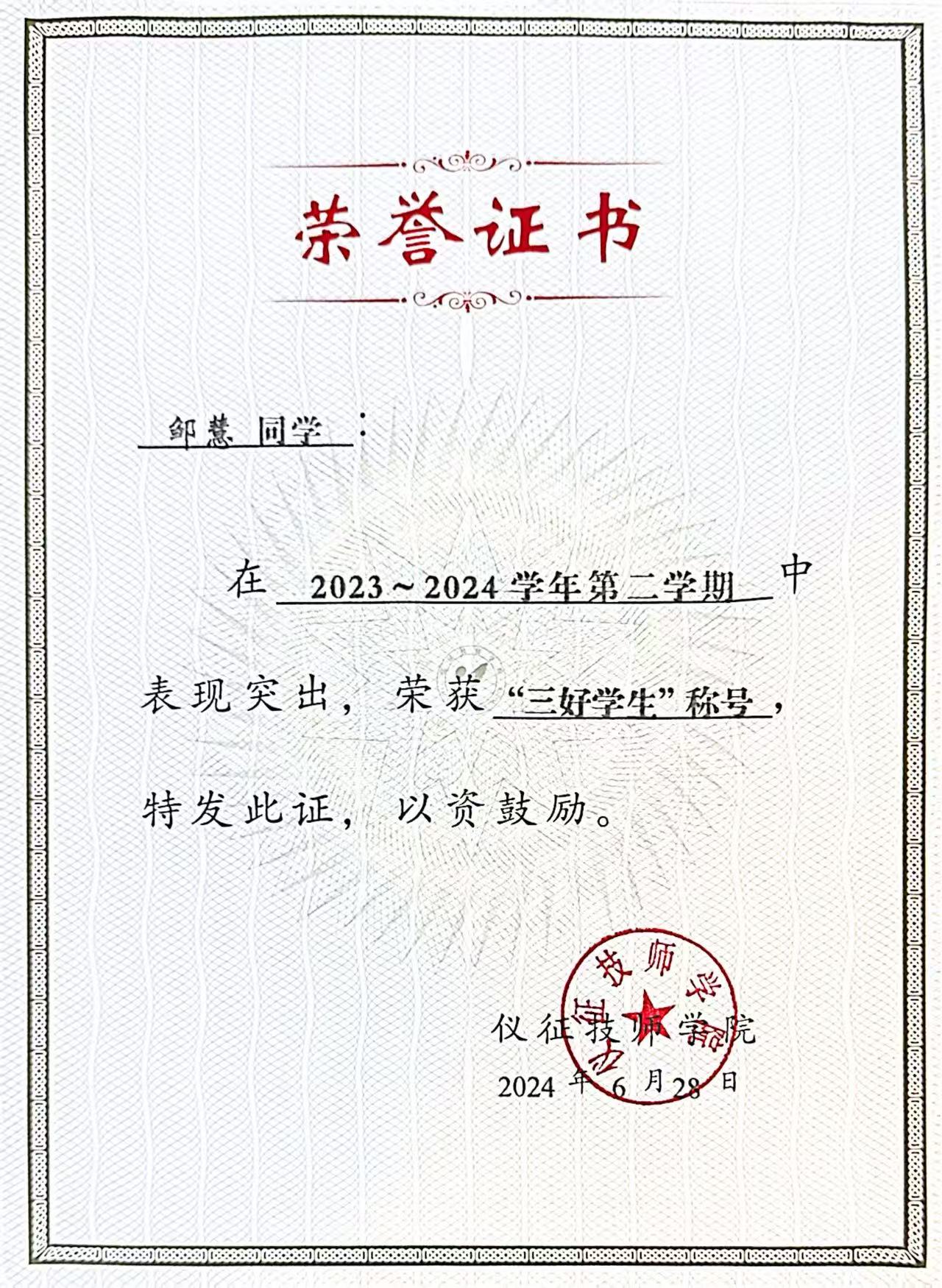 此外,邹慧还积极参与志愿服务活动。她曾参与仪征“智跑迷宫”大型公益活动志愿服务,在岗位上认真负责、细致耐心,为活动顺利开展提供了有力保障。她用实际行动诠释了“技能服务社会,行动传递温度”的理念,展现了新时代青年学生的责任与担当。