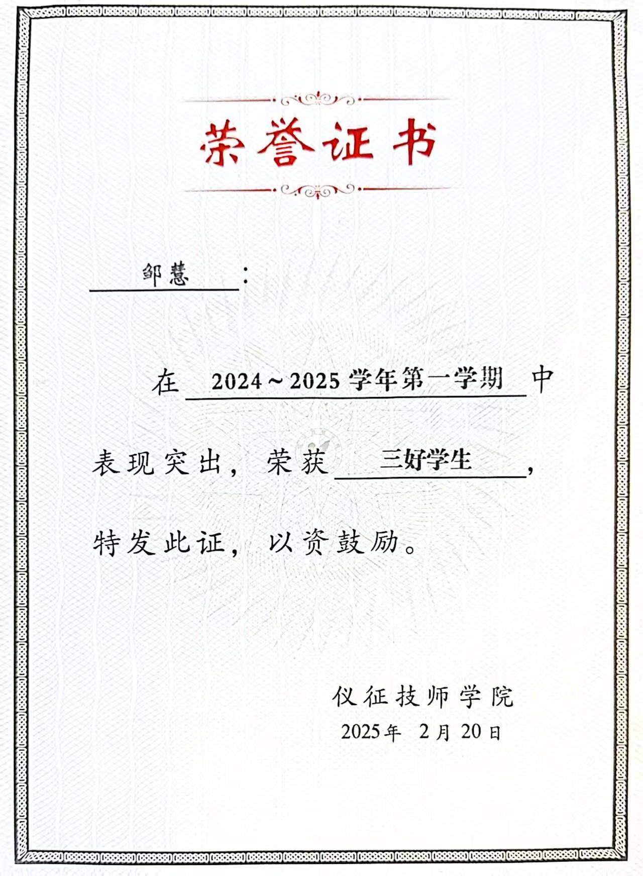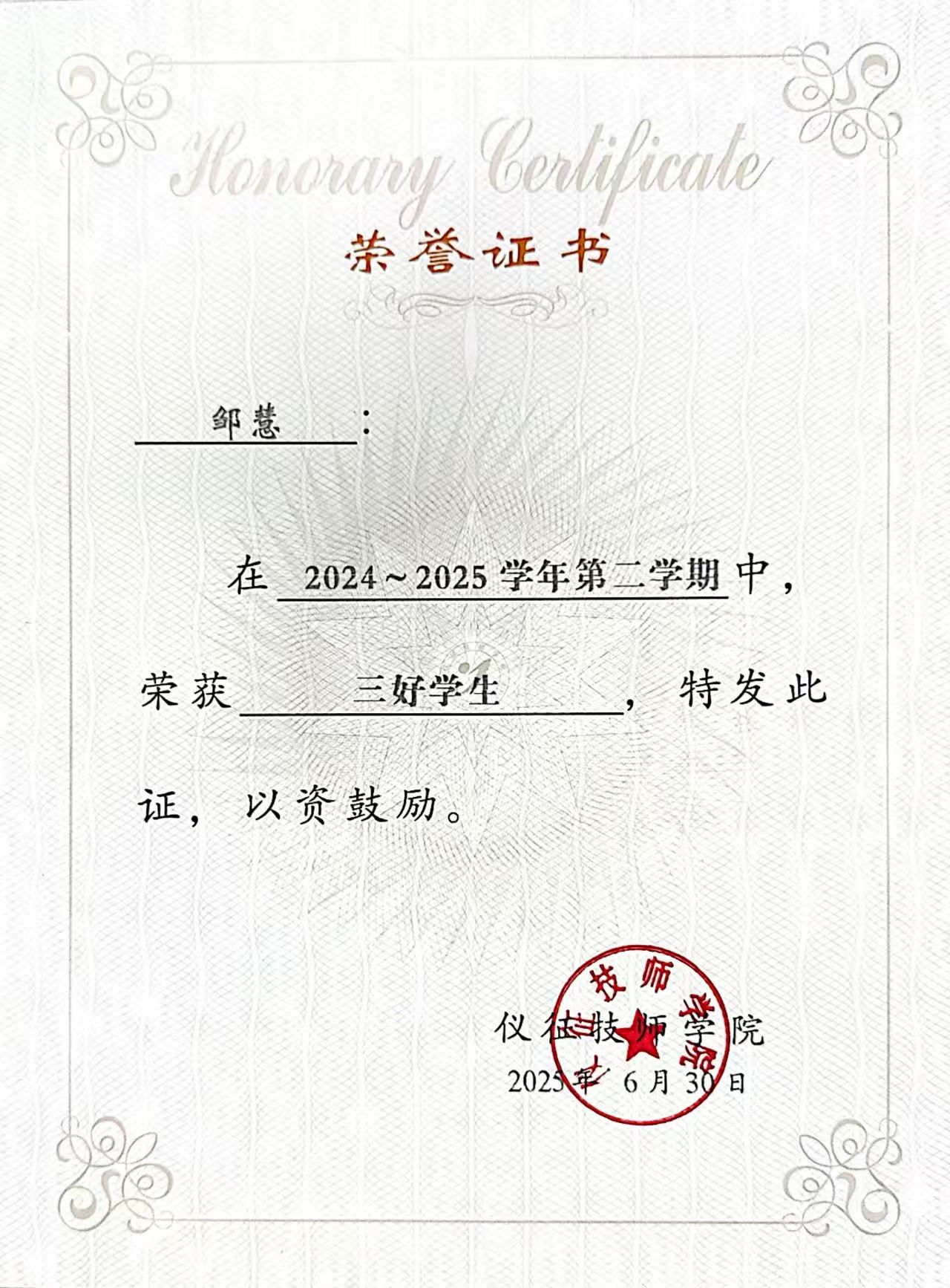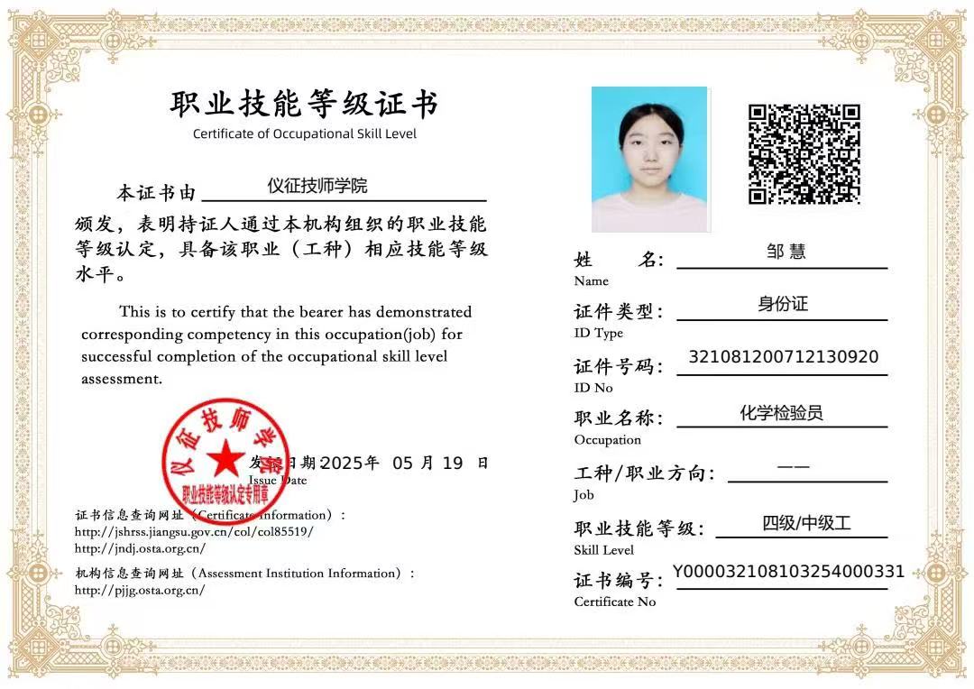 邹慧,2007年出生,共青团员。自入学以来,她始终秉持严谨认真、精益求精的学习态度,专注于专业技能的提升,在滴定实验、仪器操作等核心实训中表现突出。凭借勤奋自律的学习习惯,她的成绩长期稳居班级前列,并多次荣获“三好学生”称号。同时,她积极考取化学检验员初级工、中级工证书以及计算机一级B证书、普通话证书,不断夯实专业基础,提升综合素养。
