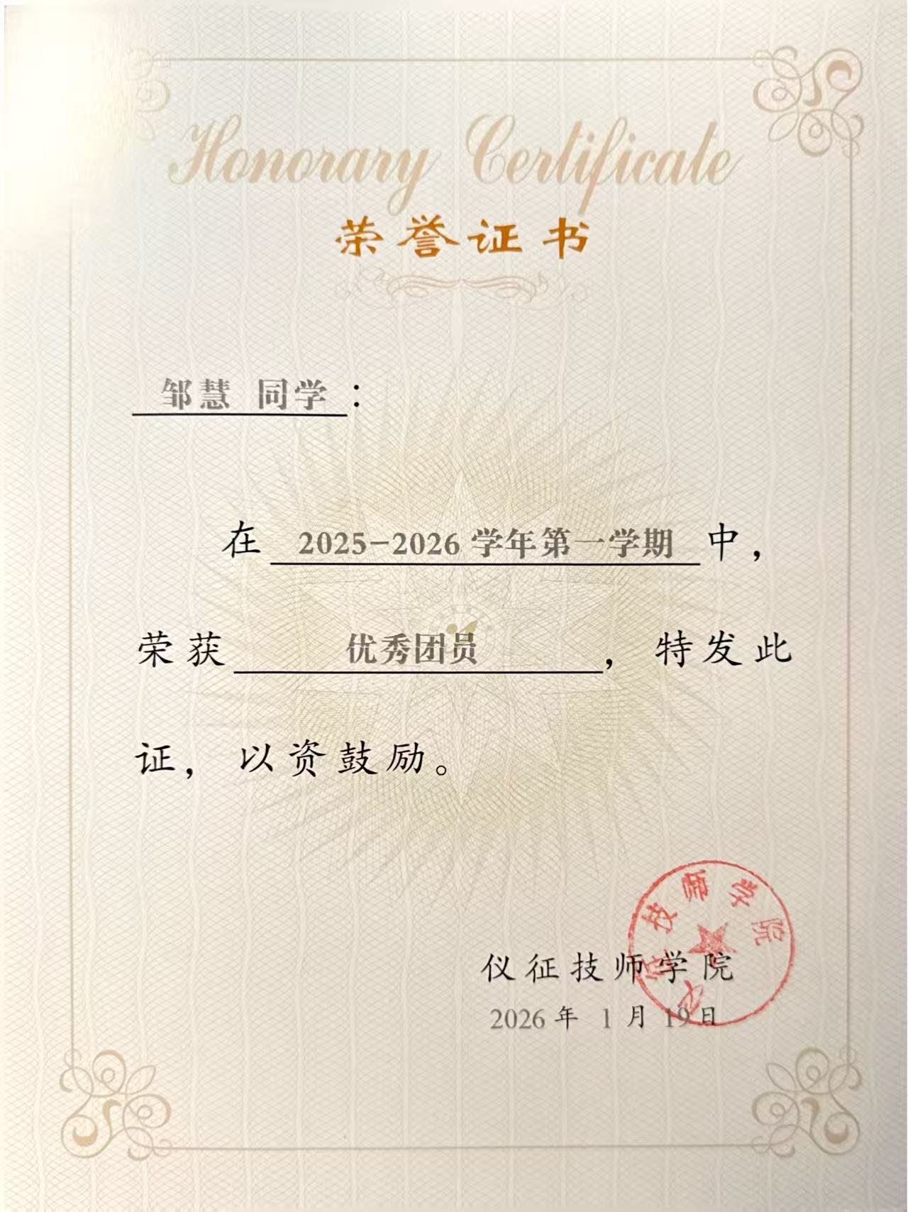 邬贝贝同学在高中三年先后担任班级多项职务。作为团支书,她主动协助老师开展工作,带领团结同学们齐心协力,共同建设思想正、学风好、专业强的班集体。她积极向团组织靠拢,光荣加入共青团,多次获评优秀团干部;主动参加学生业余党校学习,持续提升政治素养与思想觉悟,以实际行动践行青年担当。