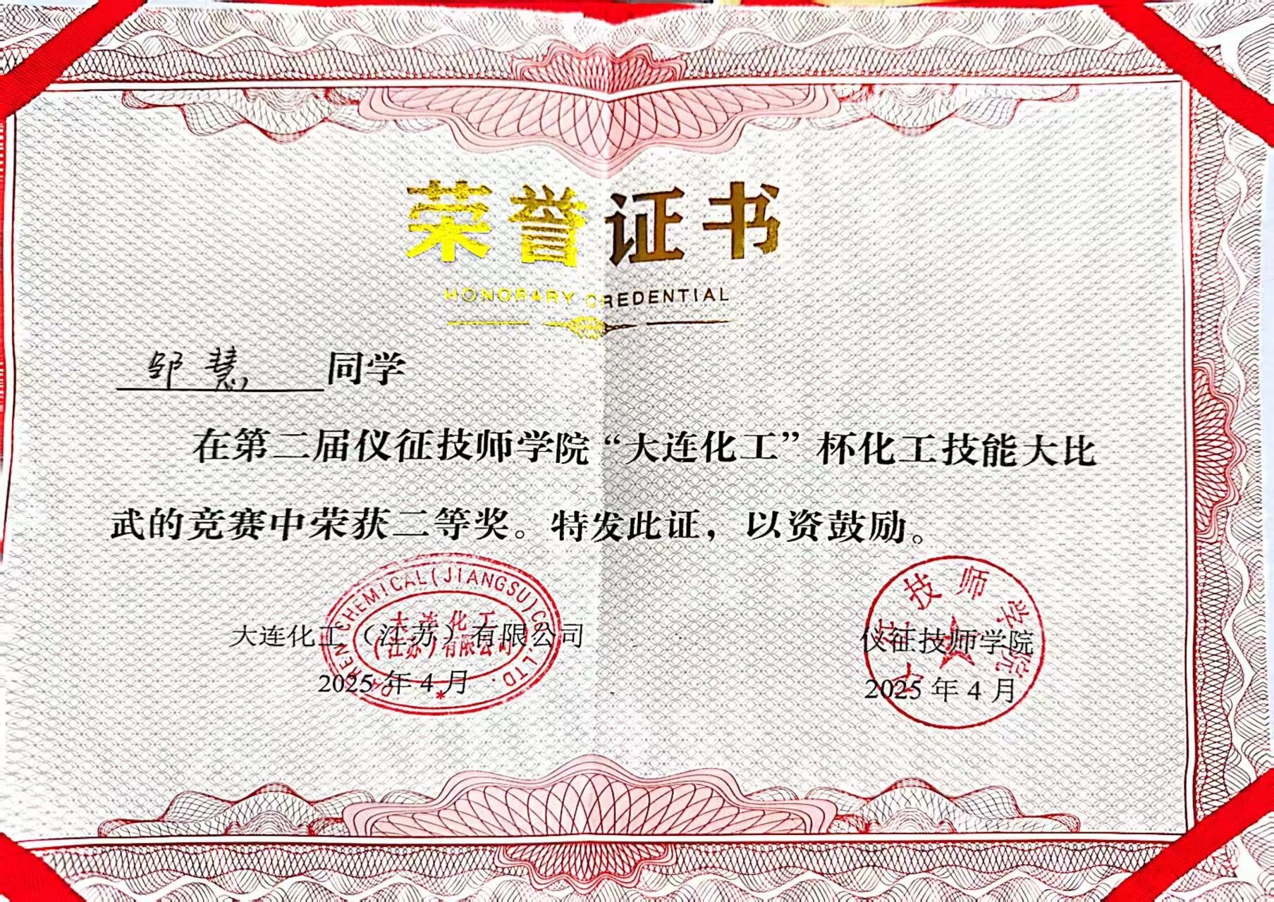 在技能竞赛方面,邹慧表现尤为亮眼。2023年,她参加“江苏工匠”岗位练兵职业技能竞赛暨江苏省生产事故应急救援职业技能竞赛总决赛,通过系统训练,熟练掌握心肺复苏、人工呼吸等急救技能,显著提升了应急处理能力。同年,她在“大连化工”杯化工技能大比武中荣获优秀奖。2025年,她在扬州市第21届中等职业学校技能大赛中斩获化学实验室项目一等奖,并成功晋级省赛;随后代表学校参加省级赛事,在更高平台上进一步锤炼专业技能与综合能力。同年,她再次在“大连化工”杯赛事中荣获二等奖,并获得二等奖学金,实现了专业成长的新突破。