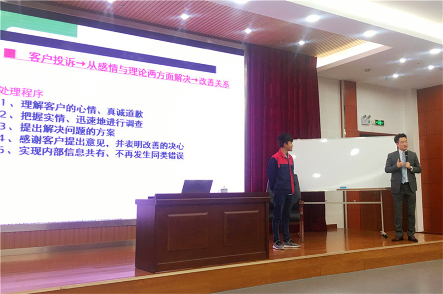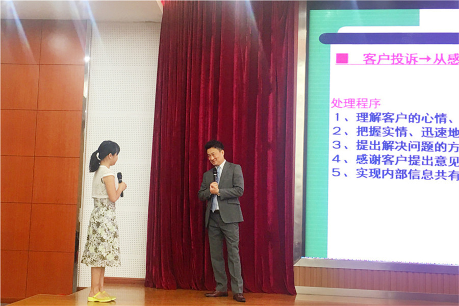 本次培训围绕职业素养、接待礼仪和园博知识展开。孙邦先生独特的授课方式吸引了志愿者们的注意力,他在台上用一连串的动作,让同学们解说他表达的信息。同学们积极参与到专家的提问中,纷纷表达自己的想法。孙邦先生通过这个小互动告诉大家,交流不只是语言,肢体也能表达不同的信息。在志愿服务中,良好的接待姿势,会让游客们有着不一样的感触。为了让志愿者们加深体会,孙邦先生还邀请同学们走上台,用情境再现的方式,教授大家在志愿活动中如何应对突发情况的处理方法,充分调动了课堂的气氛。整个培训过程内容充实,生动有趣。