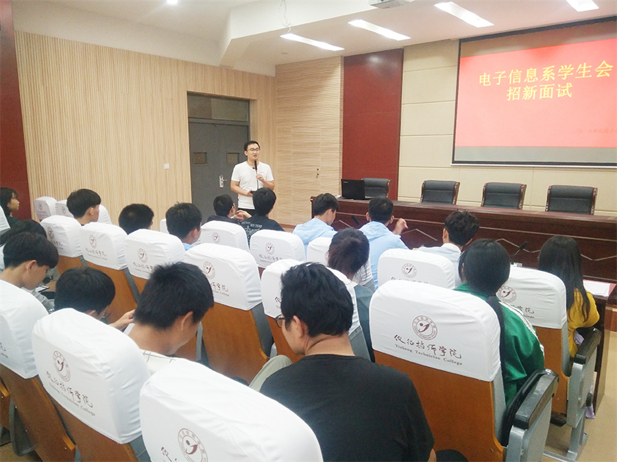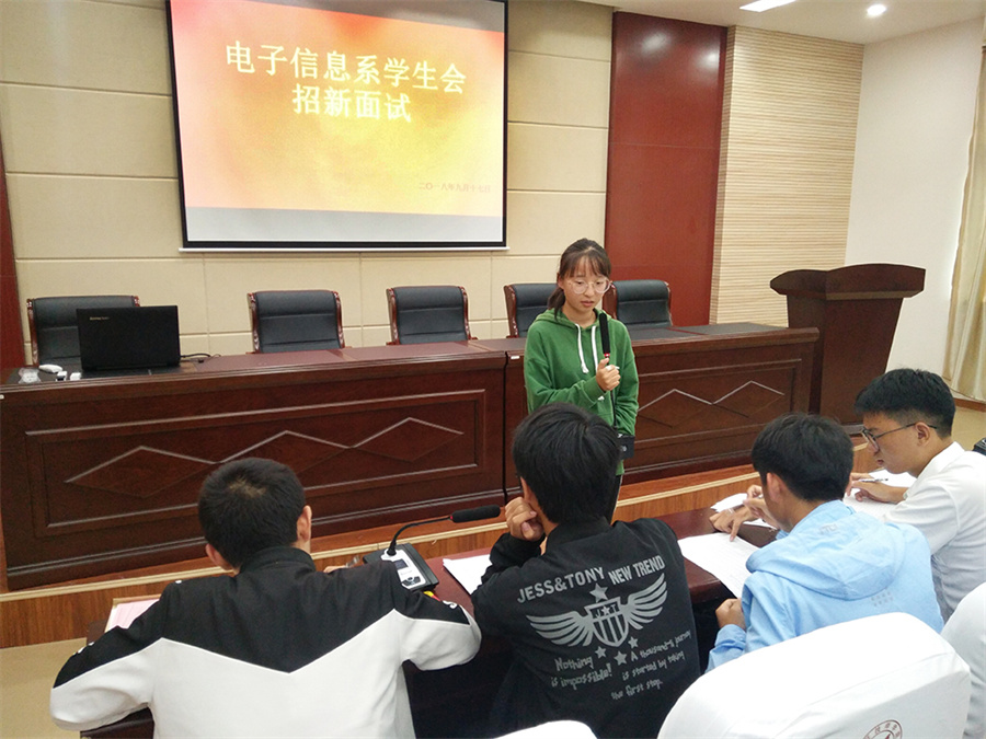 为了给新生提供一个实现价值,锻炼自我的机会,同时给系学生会注入新鲜的血液,更好地开展学生工作活动,服务同学。9月19日中午,电子信息系学生会在B208报告厅举行了招新面试。我系团总支陈泽凯老师、学生会主席周健以及各部门部长担任了本次招新面试官。