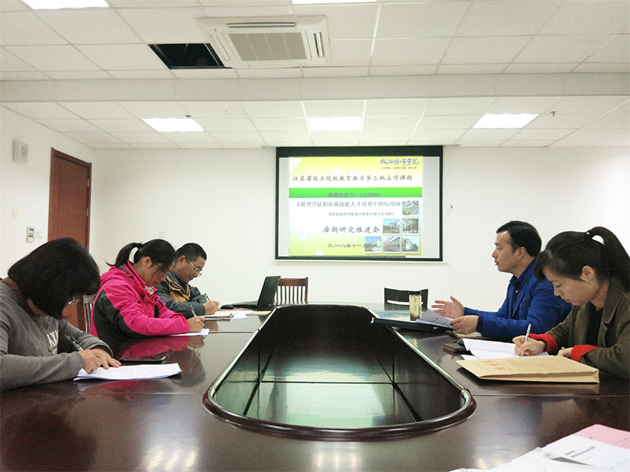 为充分发挥电子电工技术名师工作室在课题研究中的引领带动作用,更好的引导一线教师走上教育科研道路。2018年11月12日下午,江苏省技工院校教育教学第三批立项课题《企业新型学徒制在高技能人才培养中的应用研究-以仪征技师学院电子技术应用专业为例》后期研究推进会在图文信息系楼五楼会议室召开,课题组核心成员参加了此次推进会。