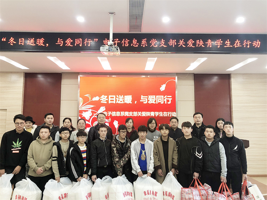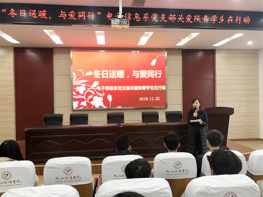 11月22日下午,我院电子信息系党支部在B208报告厅开展关爱“陕青”学生,爱心送暖活动。活动由系党支部书记宰倩倩主持,系全体党员和我系陕西、青海学生一同参加了此次活动。
