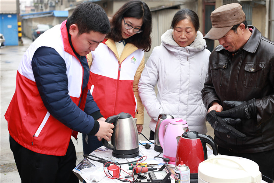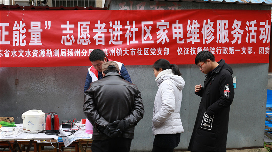 仪征技师学院行政第一支部、团委联合江苏省水文水资源勘测局扬州分局、真州镇大市社区共同举办“践行核心价值观,传递青春正能量”志愿者进社区家电维修服务活动。志愿者们充分利用自己的专业特长,为社区群众维修小家电,围绕广大群众普遍关心的家电知识、生活小常识、家电日常维护和安全使用方面等问题进行相关的解释说明。