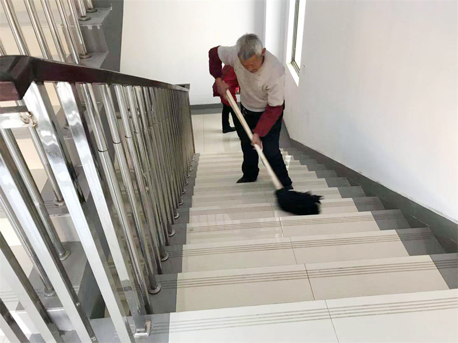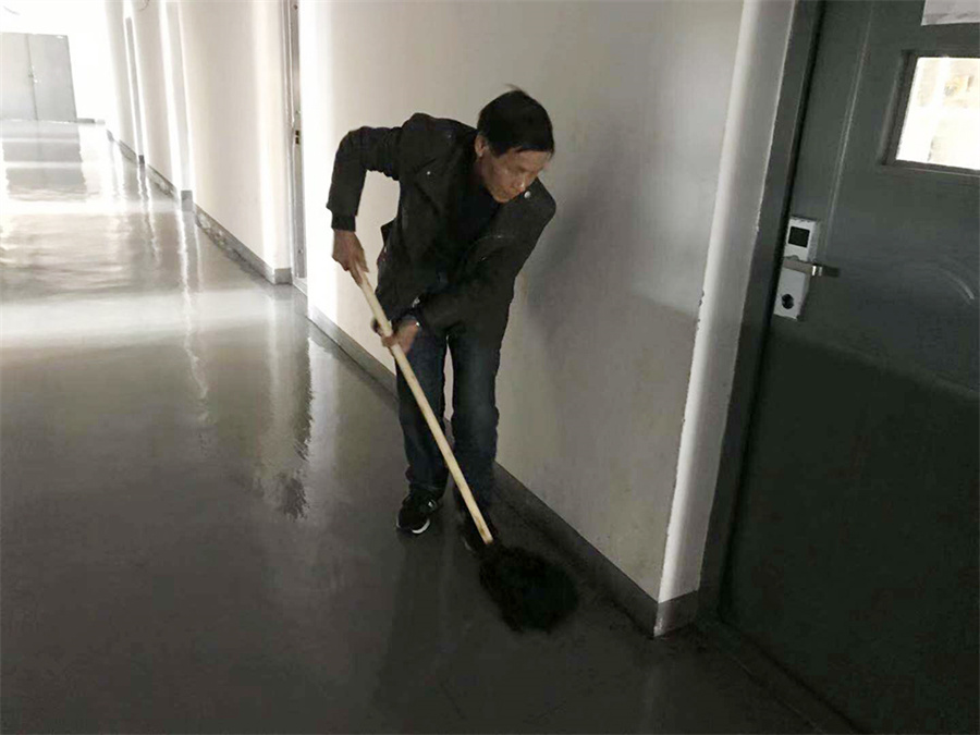 上午6:00,宿舍管理员们开始忙碌起来,他们对照评比要求,分工打扫,协作清理,共同美化。过道旁边、卫生间、台阶上、花圃中,他们时而登高昂首清理顶面,时而侧身贴墙清除鞋印,时而弯腰半蹲铲除痰迹……