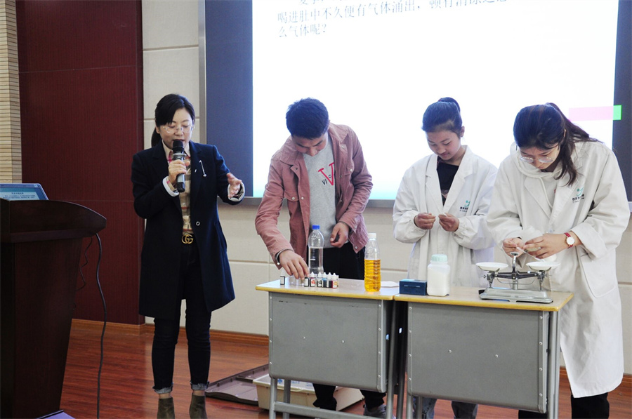 丁晓丽老师和陈怡老师在c207报告厅为见习同学做了《生活中的化学》和酒店管理两场专题讲座,台上老师热情洋溢,座下同学们聚精会神,努力听讲。两位老师以深入浅出的方式和现场实验的示范,引导同学们对化工和酒店管理有了更新、更深入的认识。讲座之后,丁老师向见习同学开放了我系的部分实训室,并在化工实训室让同学们动手做了实验。下午,陈怡老师请见习同学参观了酒店管理实训和茶艺实训,并在茶艺实训现场,请见习同学品茶道、叙友谊。