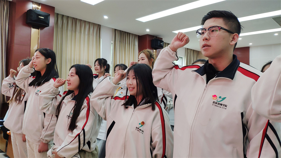 班团支部书记李静同学做了团旗下演讲。钱国钰书记带领团员代表在团旗下重温了入团誓词。钱书记希望,同学们不仅要努力学习,苦练技能,力争成为新时代的“大国工匠”,而且要积极投入到各项活动,勇于展现自我,服务社会大众,坚持“青春心向党”,立志