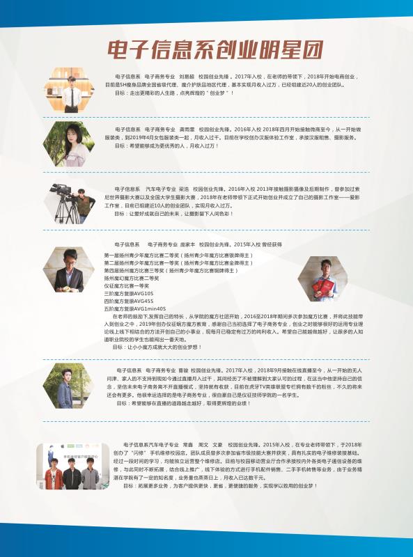通过全系师生的共同努力和积极参与。2018年度,我系电子商务专业在校生创业参与率达13.6%,涌现出了一批优秀的创业明星,如15汽车电子高级班常鑫、周文、文豪、15电子商务高级1班彭家丰、16汽车电子高级班梁浩、16电子商务高级班龚雨霏、17电子商务高级班刘易超、曹骏等优秀同学。