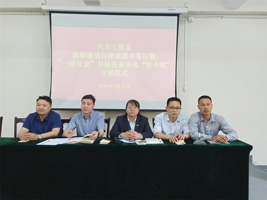 会议共分为四项议程。首先,陈宝珍副主任就2019年工作目标责任书作出了详细解读,强调所有老师都应明确工作任务目标和系部考核办法。其中特别指出云班课教学的推进和系部招生工作的强化落实,希望每位老师都能积极参与,服从学院安排。接着,各科室负责人上台签署军令状及系部“一岗双责目标责任承包书”。系学生科长朱慧代表各科室负责人作出了郑重承诺。随后,李彩兵书记在会议上与全体教师签署廉洁自律承诺书,并由赵婷婷老师代表全系教师宣读承诺书内容。