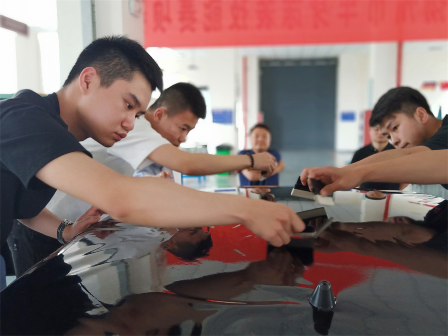 听到这么有趣的名字,老师们无一缺席,纷纷赶来想要知道“色膜”到底是什么。哦!原来“色膜”就是汽车的改色膜工艺呀!现代轿车越来越讲究个性化,很多车主为了追逐时尚、凸显个性,会花费很多的精力在汽车的美容与装饰上。汽车改色膜就是一种纯手工的技术工艺,使用到国产或者进口的色系丰富的薄膜,以整体覆盖粘贴的方式改变全车或局部的外观,为了达成“一夜改色”的魔力效果,需要在实施工艺中配合特殊工具和贴膜技巧,做到色膜与车身各部位贴合的天衣无缝,没有任何缺陷。