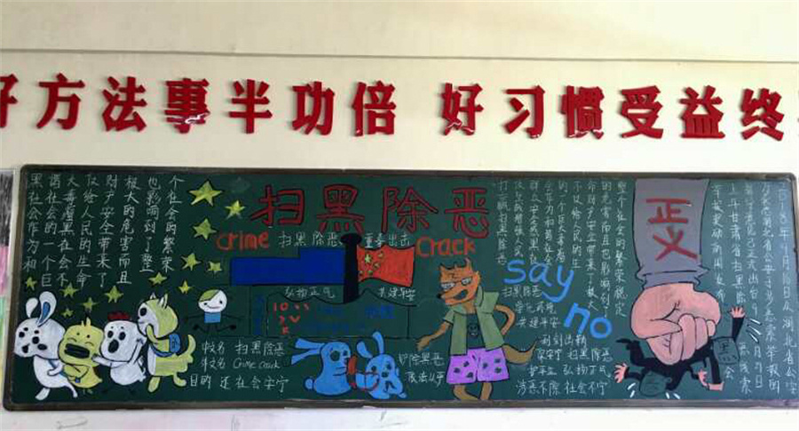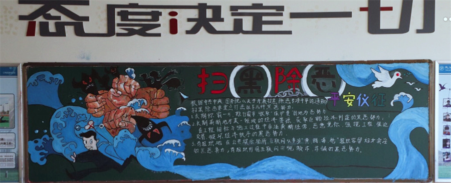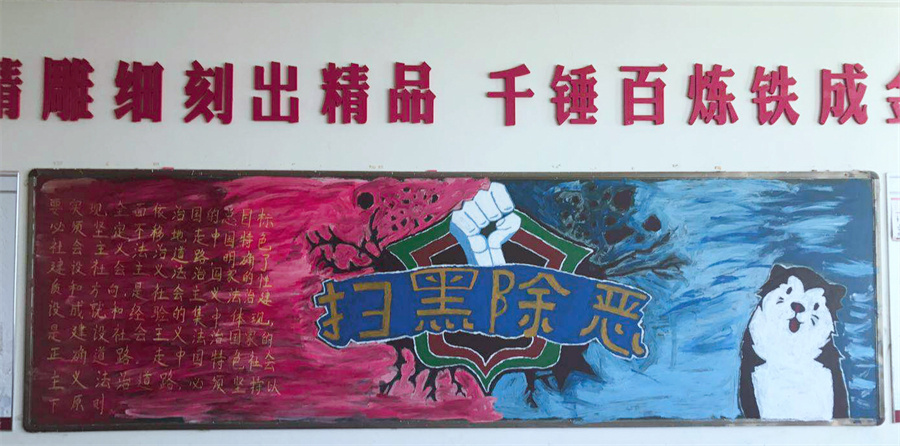 经过前期精心的准备,在班主任和同学们的共同努力下,各班紧紧围绕“扫黑除恶·弘扬正气”的主题,精心选材并设计方案,仔细抄写、细致描画,用文字、图片、漫画等多种形式充分展示扫黑除恶专项斗争的重要作用和意义。