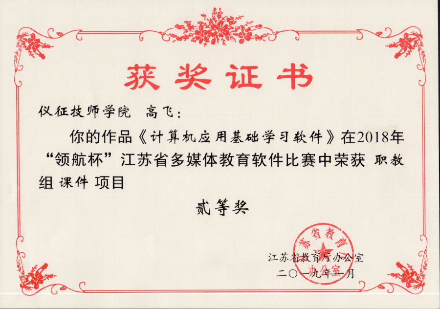 在扬州市多媒体教育软件比赛中,我院高飞、陈波2位老师的微课、课件类作品脱颖而出,被推荐代表扬州市中等职业教育组参加江苏省领航杯多媒体教育软件大赛,其中陈波、高飞老师的微课作品《百分表的使用》、《Flash逐频动画》,高飞老师的课件《计算机病毒》、《计算机应用基础学习软件》均荣获二等奖!