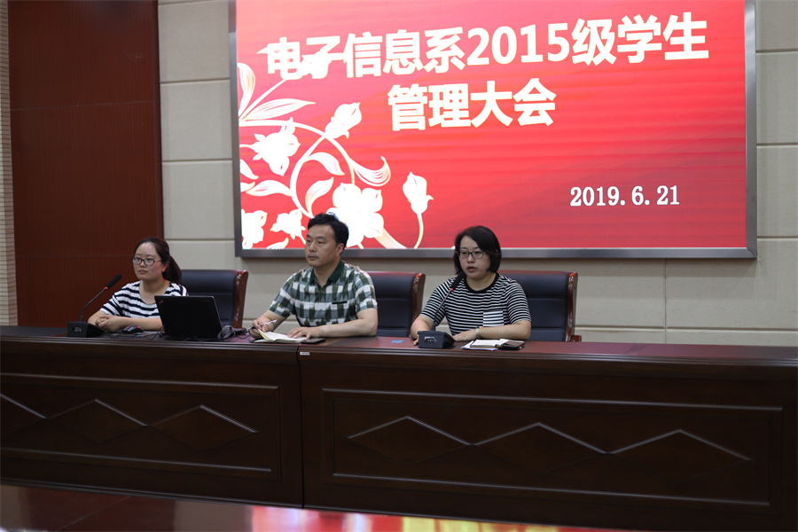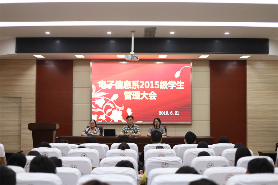 为强化年底顶岗实习班级的学生管理,帮助顶岗实习学生树立正确的就业观。6月21日下午,电子信息系学生科在B208报告厅召开2015级学生管理大会,系陈恩平主任、武晓燕副主任、15级班主任及15级全体学生参加了会议,会议由学生科束颖丹科长主持。