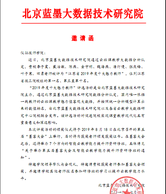 日前,由北京蓝墨大数据技术研究院主办的“2019年度十大魅力教师”省级评选结果正式公示,我院9名教师获评“江苏省2019年度十大魅力教师(技工院校组)”。