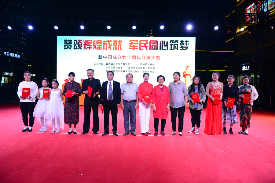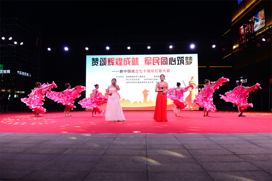 为深入贯彻落实习近平总书记“用实际行动把红色基因一代代传下去”的要求和勉励,激发群众的爱党爱国热情,增强实现中华民族伟大复兴的使命感和责任感。9月28日晚,由真州镇退役军人服务站、真州镇优抚站、仪征技师学院行政第一党支部、现代服务管理系党支部、滨江社区党支部主办的“赞颂辉煌成就 军民同心筑梦——新中国成立70周年红歌大赛”在宝能环球汇激情唱响。比赛前社区居民观赏了由技师学院精心拍摄的快闪视频《我和我的祖国》,点燃了现场气氛!