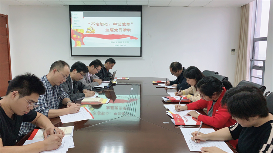 为了深入学习贯彻“不忘初心 牢记使命”主题教育会议精神,统筹落实好主题教育各项任务,10月10日下午,机电工程系党支部在图文信息楼七楼东会议室举行主题党日活动,会议由支部书记赵娟主持,支部全体党员参加了会议。