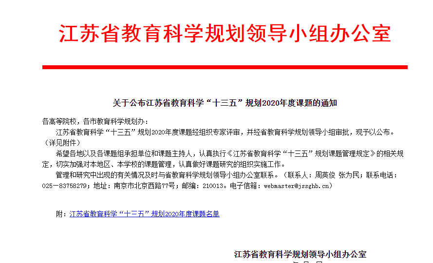 近日,江苏省教育科学“十三五”规划2020年度课题立项评审结果已经揭晓,经专家评审,我院在此次申报中共有2个课题成功立项。
