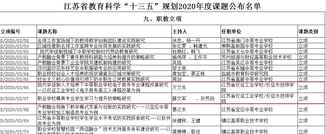 在本次评审中,学院机电工程系薛文军、孙苏扬老师申报的《职业学校模具专业学生学习力提升的策略研究》和电子信息系万文兵老师申报的《现代学徒制人才培养下中等职业学校电子商务专业课程改革的研究》2项课题喜获省级立项。