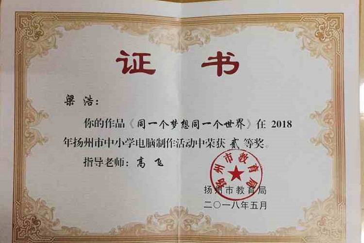 “天道酬勤”的理念来督促自己的课堂学习,坚持每天上课认真听讲,课后认真复习,并利用课余时间不断拓宽自身的知识面,通过网络媒体学习与专业相关的知识,先后获得多项荣誉称号,曾获2018年扬州市中小学生电脑制作二等奖、2016-2017学年优秀团干、校园微视频制作一等奖、最佳vcr奖四次等荣誉。