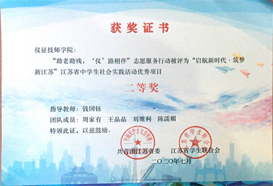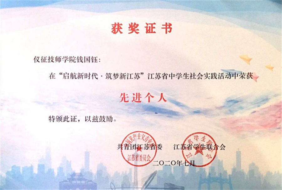 近日,我院钱国钰等师生受到表彰。在由共青团江苏省委、江苏省学生联合会共同举办的“起航新时代.筑梦新江苏”江苏省中学生社会实践活动中,钱国钰老师荣获“先进个人”称号,钱国钰老师和周家有、王晶晶、刘维利、陈濡媚等同学组成的社会实践团队荣获二等奖。