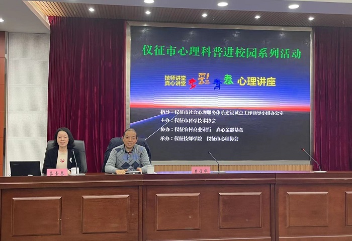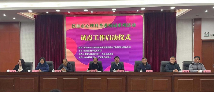 为全面推进仪征市学生心理健康教育工作,普及心理健康知识,提高学生心理健康教育的科学性、规范性和实效性,12月23日下午,仪征市心理科普进校园活动试点工作启动仪式在仪征技师学院图文信息楼10楼报告厅举行。南京大学副教授、心理中心主任、应用心理专业硕士导师费俊峰博士和江苏省心理协会理事长、南京师范大学心理学院院长邓铸教授等两位嘉宾,仪征市科协党组书记、主席唐济学、仪征市社会心理服务体系建设试点工作领导小组办公室主任、市卫健委副主任严华、仪征技师学院副院长周万春等领导出席启动仪式,仪征心理协会会长孔繁仑及副会长张远伟、部分仪征市心理专家、仪征技师学院师生代表也参加了启动仪式。启动仪式由仪征市科协党组副书记、副主席吴素琴主持。