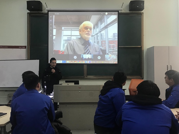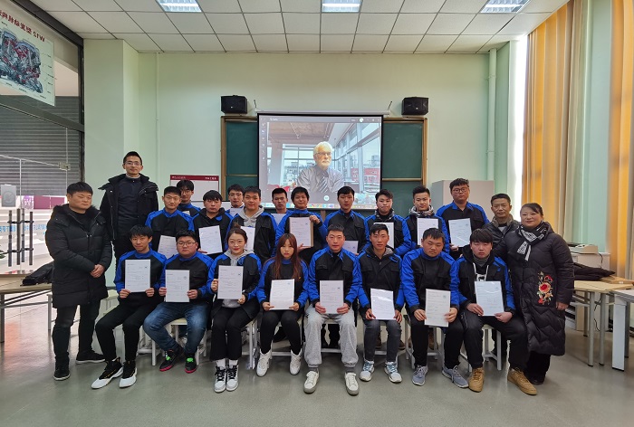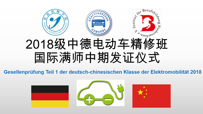 2021年1月7日下午2:00,我院2018级中德电动车精修班满师考试第一部分考试发证仪式在L201 新能源汽车多功能电气基础实验室举行。德国下萨克森州职业教育研究所董事、汽车教育专家毕尔申克(Bierschenk)先生联网见证、2018级电动车班级学生及项目组杨定军、李万奎老师,2019级电动车班级学生观摩仪式,本次仪式由汽车工程系副主任陈宝珍主持,钟威翻译。