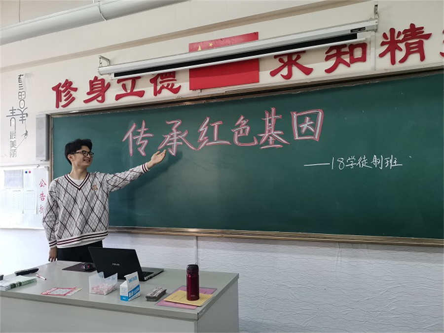 集体合唱爱国歌曲。“起来,不愿做奴隶的人们……中华民族到了最危险的时候……”,“狼烟起,江山北望……我愿守土复开疆,堂堂中国要让四方来贺”,“在茫茫的人海里我是哪一个,在奔腾的浪花里我是哪一朵……不需要你认识我,不渴望你知道我,我把青春融进,融进祖国的山河”……热血的青春在一首首爱国歌曲中被点燃,传承红色基因对老师十分重要,对学生更是重中之重,愿我们每个人的未来都有星辰大海,繁华盛开。