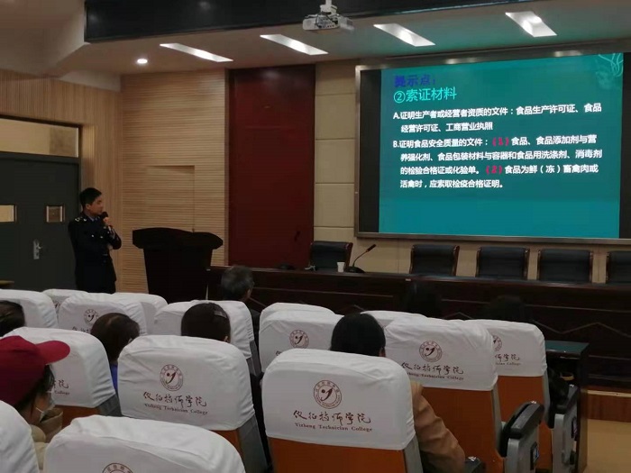 为提高相关从业人员的业务能力和素养,进一步做好学院食品安全卫生管理工作,服务好广大师生,2021年4月15日下午1:30,我院后保处邀请仪征市市场监督管理局和经济开发区分局相关领导和专家来校对食堂、小卖部相关从业人员作有关食品安全卫生的专题讲座。讲座的内容涉及食品卫生管理的相关法律法规、食品卫生的监督与管理,食品安全卫生工作要求等。讲座结束后,后勤服务公司彭军经理要求要参会人员应本着对自己负责、对工作负责、服务好广大师生的原则,认真学习消化讲座的内容并将其落实贯彻到今后的工作中,切实保证食品卫生安全,为创建平安和谐校园尽一份力。