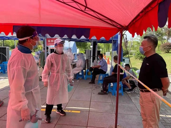 8月3日,全市第一轮核酸检测时我主动请缨参加“战斗”,在三将村核酸检测点,身穿隔离服做检测点消毒水喷洒工作。我和其他志愿者一样,炎日下稍微动一动就全身汗水,一天下来全身上下湿了干,干了湿,犹如蒸桑拿。