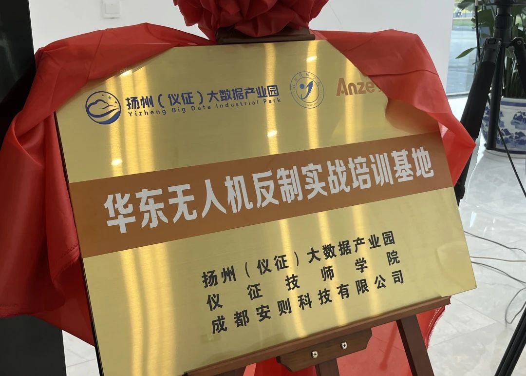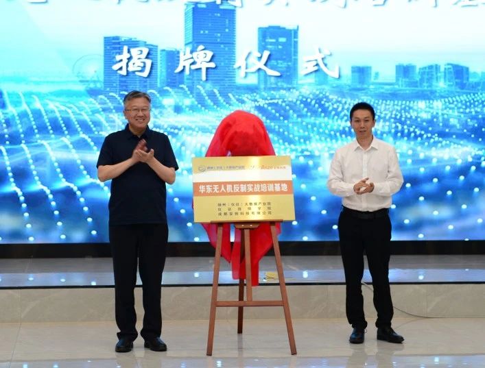 仪征市委书记孙建年与成都安则科技有限公司董事长许成共同为政校企联合打造的华东无人机反制实战培训基地揭牌。
