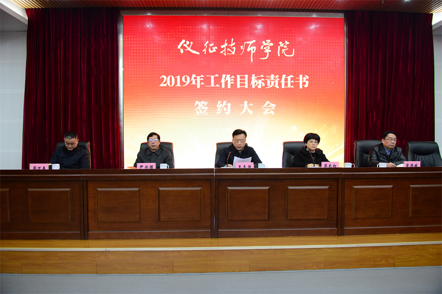 大会分为四项议程:一是由部门代表宣读《党风廉政建设目标责任书》和《工作目标责任书》内容;二是王志强院长代表学院与各部门负责人、各党支部书记签订2019年《党风廉政建设目标责任书》和《工作目标责任书》;三是由办公室、汽车工程系代表分别作表态发言;四是由王院长作动员讲话。