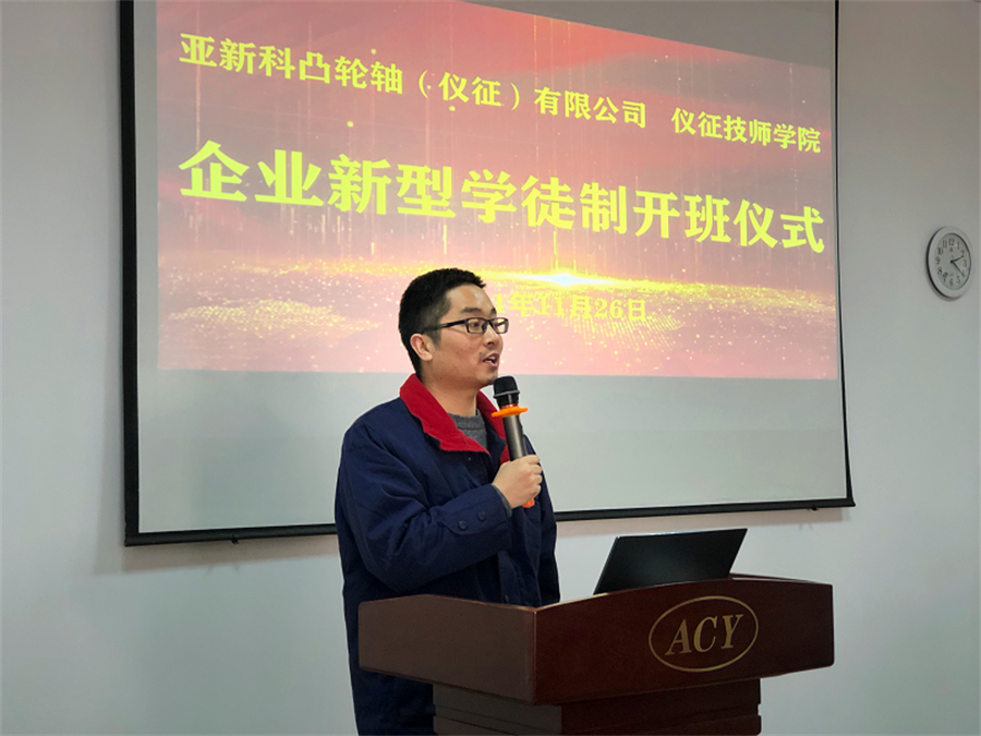 为加快建设知识型、技能型、创新型的劳动者队伍, 11月26日下午亚新科凸轮轴(仪征)有限公司——仪征技师学院企业新型学徒制、江苏仪征亚新科双环活塞环有限公司——仪征技师学院企业新型学徒制开班仪式分别举行。两个公司的相关领导、仪征技师学院副院长周志红、培训处负责人主任许晓蓓、机电工程系主任孙苏扬、企业导师代表、全体“学徒制班”学员以及仪征技师学院部分教师代表参加了仪式。开班仪式由机电系副主任陈军主持。