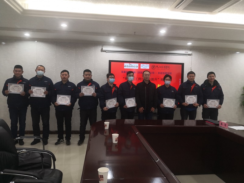 首先,仪征技师学院机电工程系孙龙高老师进行了培训总结,岗位能力提升班学员代表王宇俊交流了培训学习心得体会;然后,亚新科凸轮轴(仪征)有限公司生产副总经理吉友群和仪征技师学院副院长尹为国为全体学员颁发了结业证书;最后,机电工程系孙苏扬主任和亚新科凸轮轴(仪征)有限公司行政人事总监钱军分别发表讲话。