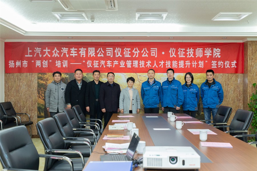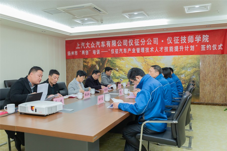 12月12日下午,仪征技师学院与上汽大众汽车有限公司仪征分公司在图文信息楼902举行 “双创”培训合作签约仪式。上汽大众汽车有限公司仪征分公司人事总监朱捷高级经理、仪征技师学院周志红副院长、凌洪斌院长助理、公司及学院相关部门负责人参加仪式。会议由学院社会培训部部长朱波主持。