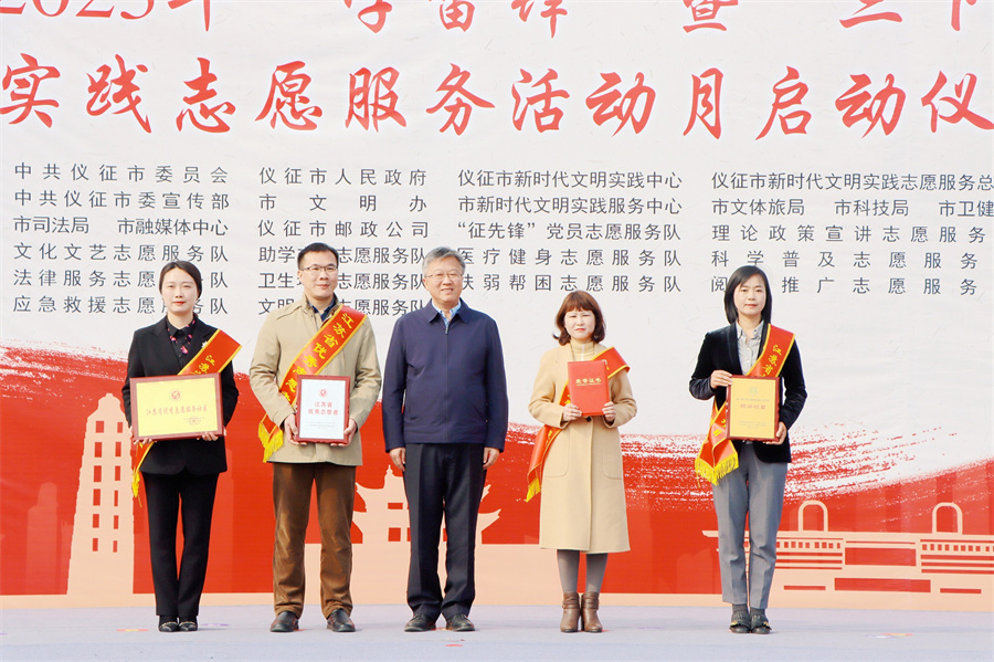 启动仪式上,仪征市委书记孙建年为仪征技师学院全国2022年中学生志愿服务示范项目“青春不负 ‘志’存高远”颁奖,机电工程系团总支书记魏海燕作为代表领奖。