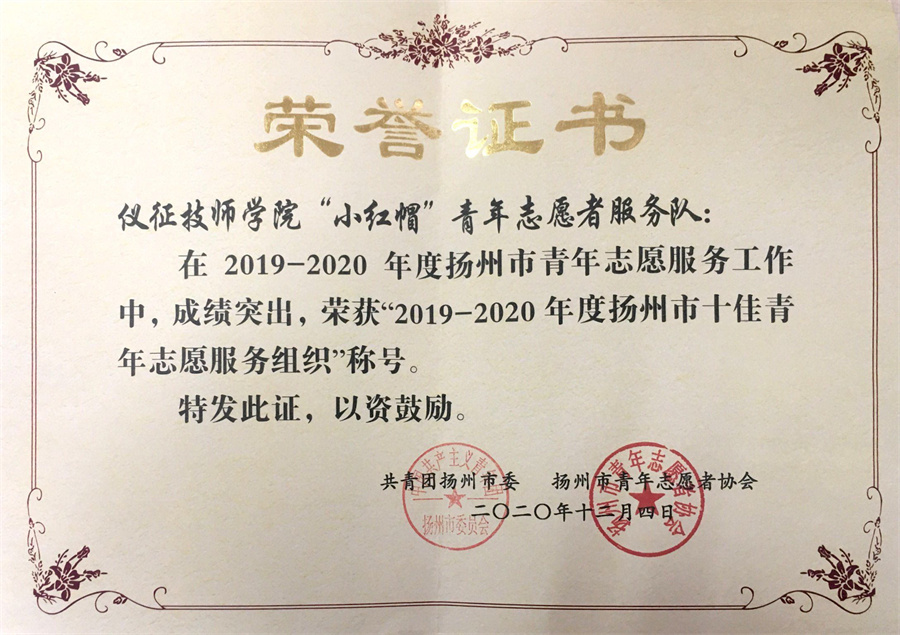 为进一步推进青年志愿者行动深入开展,激发广大青年志愿者的参与热情和积极性,扬州团市委、扬州青年志愿者协会命名表彰了一批在志愿服务活动中成绩突出的优秀青年志愿者、优秀志愿服务组织及项目。我院“小红帽”青年志愿者服务队荣获“2019-2020年度扬州市十佳青年志愿服务组织”称号。